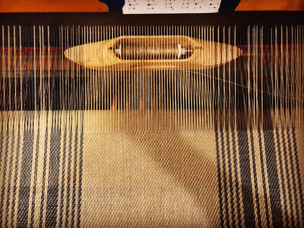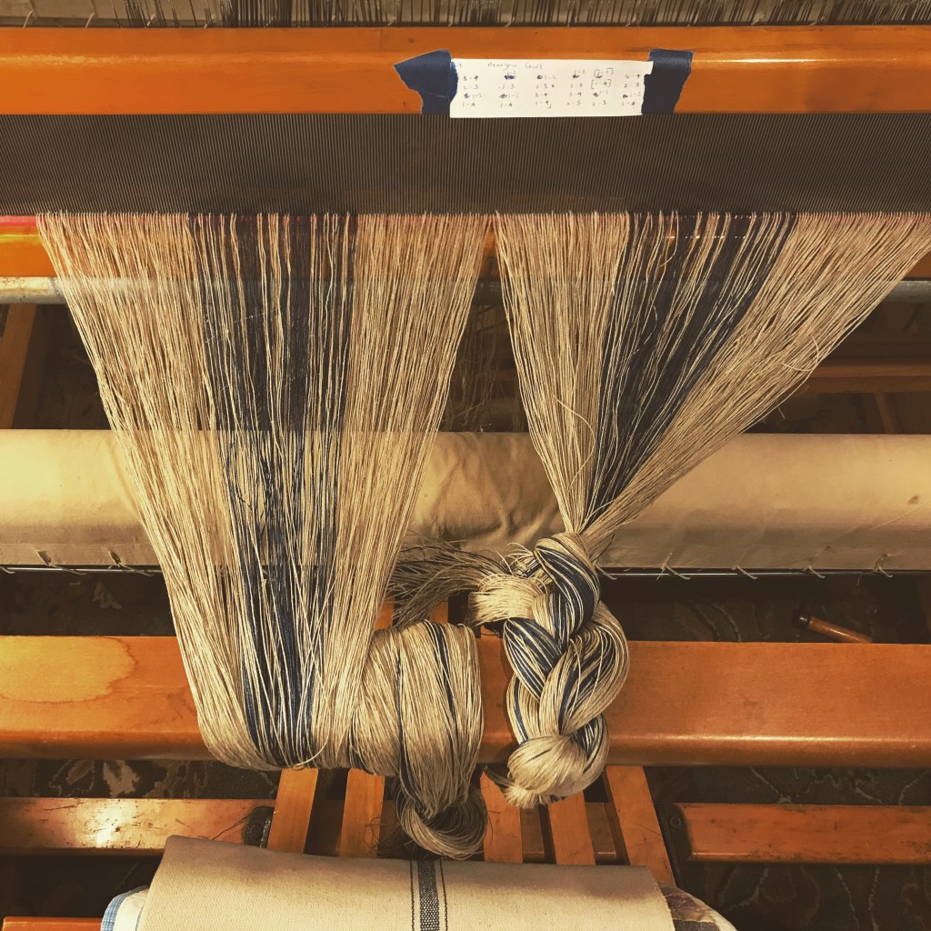 I chose Bockens 16/2 linen (colors 0000 and 603) for the warp and wound 650 warp ends measuring 2 yards in length. (The online pattern isn’t entirely clear on the total number of warp ends, but 650 will do it, which includes two floating selvedges). I sleyed a 12 dent reed with two warp ends per dent for a total EPI of 24. The pattern calls for a 2-2 twill, so I threaded the heddles in a straight draw. After tying on, beaming the warp, and then tying onto the breast beam, I was ready to weave.