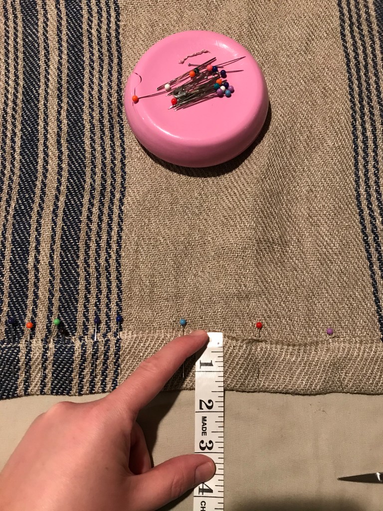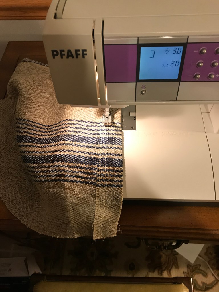 After that, I lined up the selvedges as best I could (they were pretty wonky) and sewed a 1/2″ hem along the side. I didn’t sew all the way up to the top of the bag because that would have sewed up the openings for the casing. So, I stopped when I got to the casing.